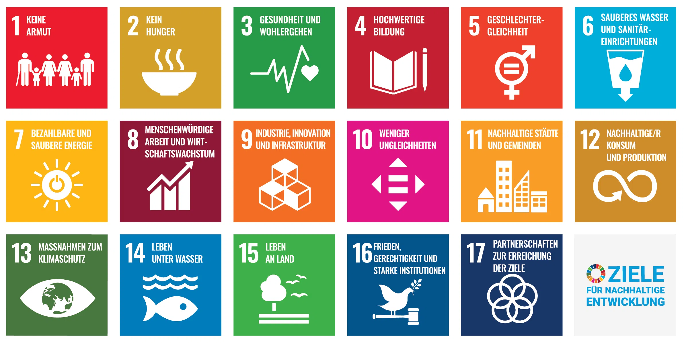 International sind diese 17 Ziele auch als die Sustainable Development Goals (SDGs) bekannt. Das ist ein globaler Plan zur Förderung nachhaltigen Friedens und Wohlstands und zum Schutz unseres Planeten. Bei uns sind die jeweiligen Themenfelder den Zielen zugeordnet.